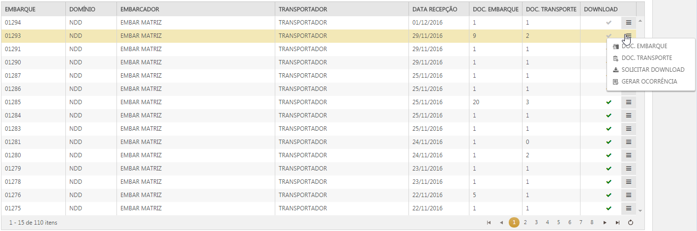 O download das NF-es é realizado através de solicitação, disponível nas opções do embarque. É possível identificar os embarques que tiveram solicitação de download pela coluna DOWNLOAD, já o processamento da solicitação, pode ser acompanhado no menu Download.