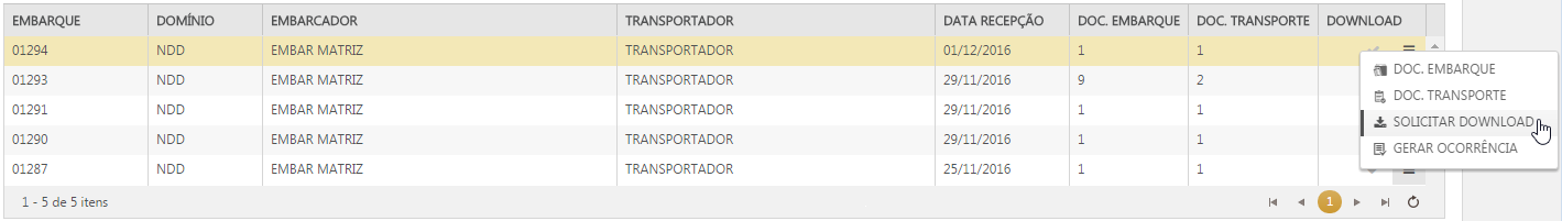 O download das NF-es vinculadas ao embarque acontece através de solicitações, as quais são processadas e em seguida, disponibilizadas para download. A solicitação pode ser realizada através da opção SOLICITAR DOWNLOAD, para os embarques que estão com a coluna DOWNLOAD marcada como não solicitado, pois a menos que os documentos do embarque sejam alterados, cada usuário pode solicitar apenas uma vez o download das NF-es de cada embarque.