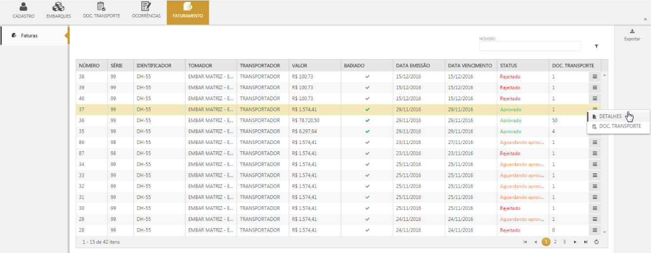 •Aprovado: Refere-se à fatura sem pendências, aprovada manualmente pelo embarcador ou automaticamente pela Localização (quando a soma dos valores dos CT-es é equivalente ou inferior ao valor planejado para o embarque);
