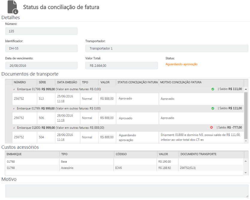 • Aguardando aprovação: Informa que o valor da fatura (soma do valor a receber dos CT-es normais informados no DOCCOB) é maior que o valor do shipment e o embarcador deve aprovar a diferença;