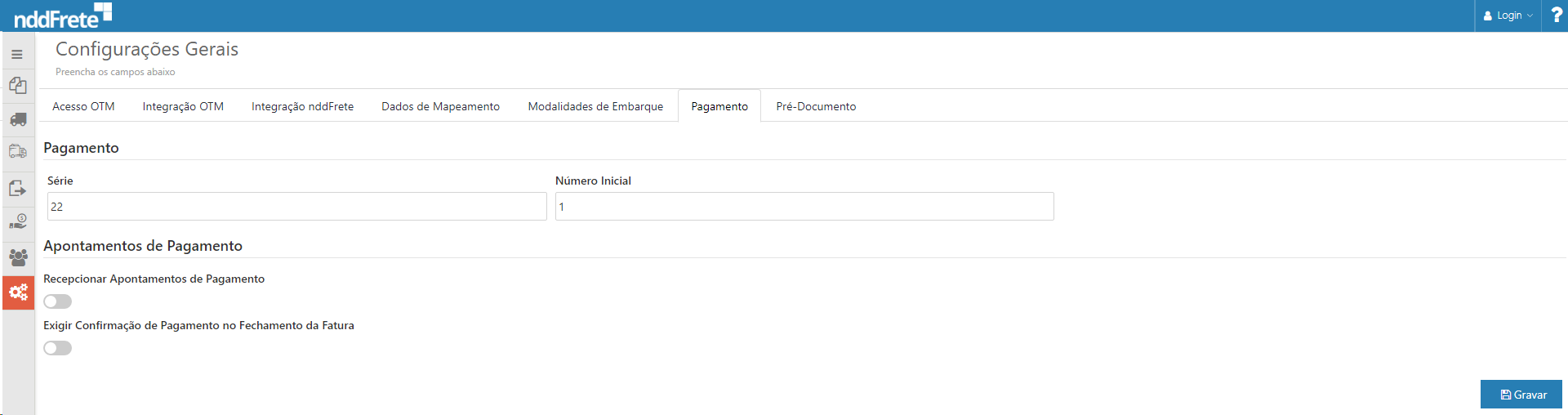 Na aba "pagamento" é possível configurar a série e o número inicial para geração das faturas a serem enviadas aos transportadores.