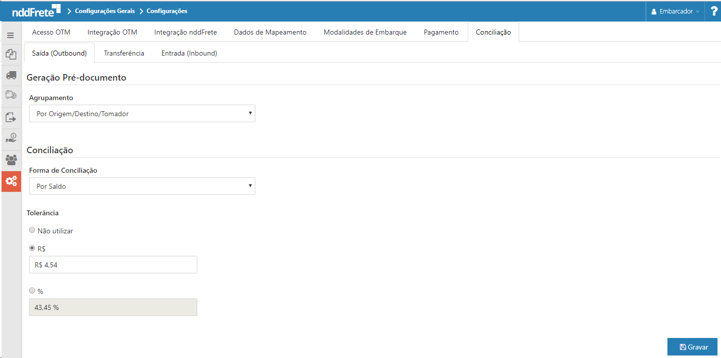 •Por Saldo: O pré-documento não será gerado e a conciliação deve ser realizada pelo saldo do Embarque.