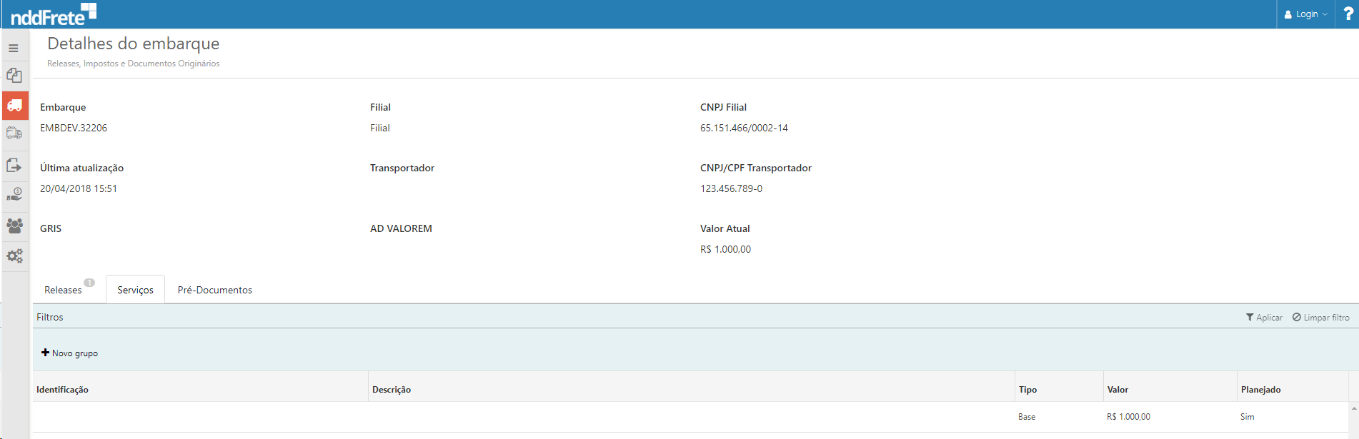 Na aba de Serviços, apresentada na tela de detalhes do embarque, é apresentado todos os serviços cadastrados para o transportador vinculado ao embarque selecionado.