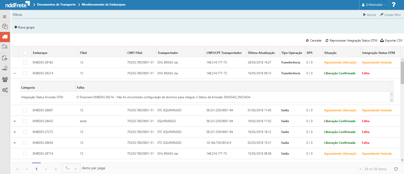 É possível visualizar as falhas de Integração nos detalhes do Embarque, conforme imagem a seguir.