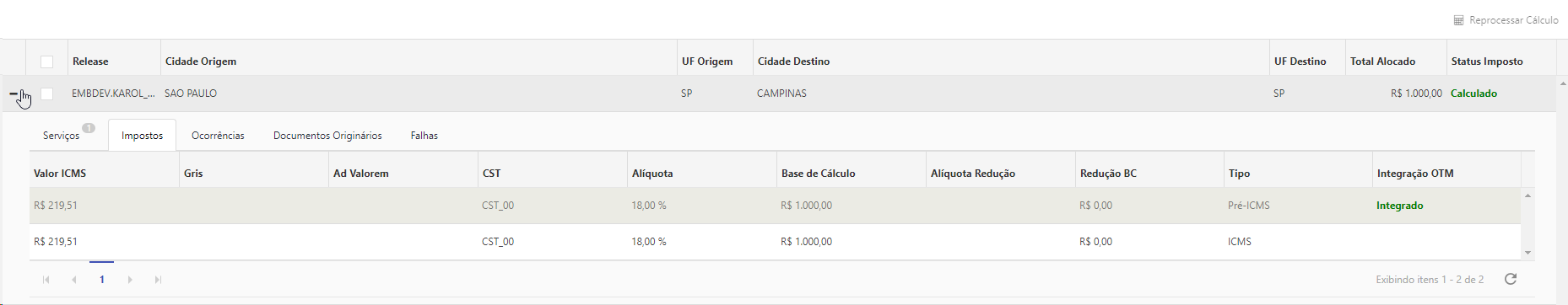 Caso o status do imposto for igual à Falha no cálculo, é possível realizar o reprocessamento do cálculo.
