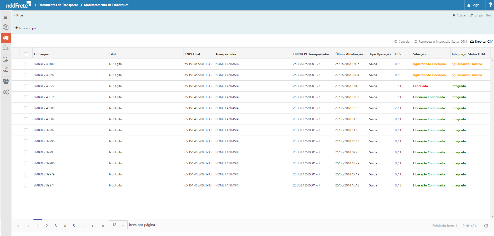 Na área principal da tela são exibidos todos os embarques recepcionados: