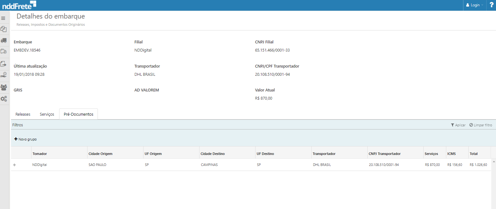 Na aba de pré documentos é apresentado todos os pré-documentos que pertencem ao Embarque acessado.