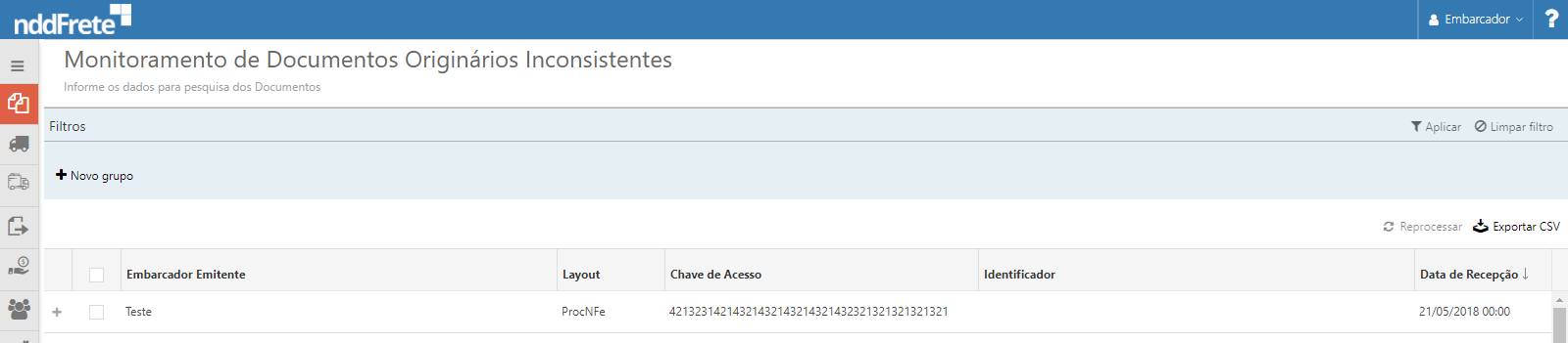 Através da tela de documentos inconsistentes, o usuário pode acompanhar o documento que não teve seu processo realizado com sucesso. Nela somente serão apresentados os documentos que possuem alguma inconsistência e podem ser reprocessados manualmente, sem ter a necessidade de o ERP realizar uma nova chamada.