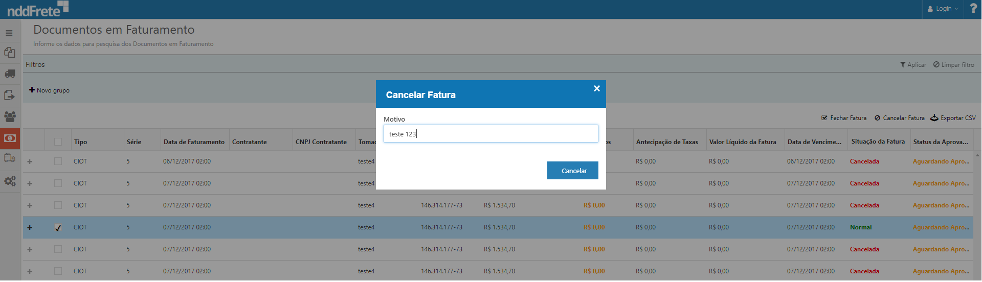 • Motivo: Campo de texto livre onde o usuário informa um motivo pelo qual cancelou a Fatura no momento da ação de "Cancelar Fatura".