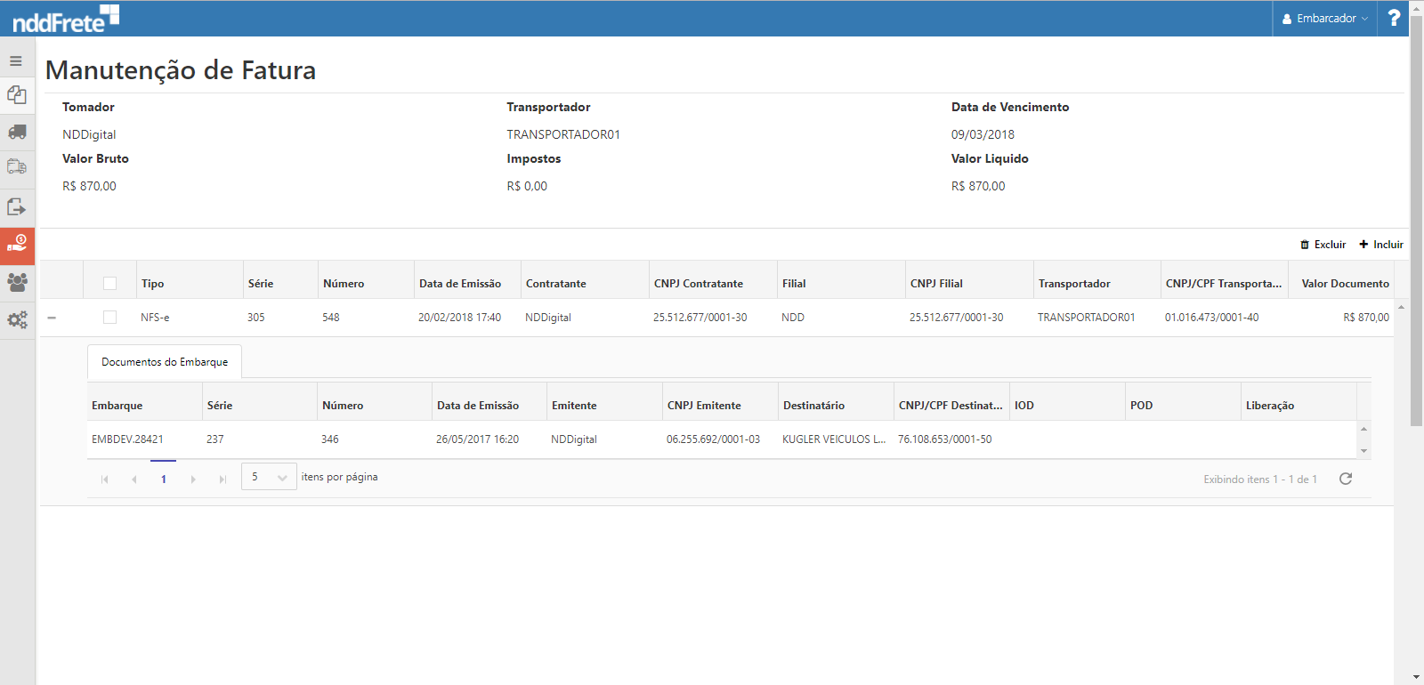 Na opção "incluir" é listado apenas os DPS's que são do mesmo transportador e tomador da fatura em edição. |