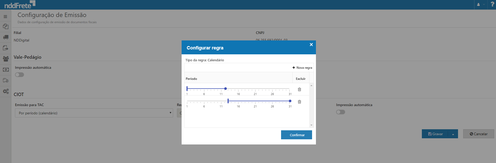 Clique em Confirmar, para finalizar a configuração da emissão do CIOT.