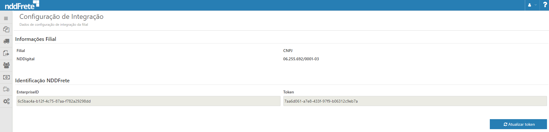 Nela é apresentado as informações básicas da Filial (Nome e CNPJ), bem como a identificação da mesma no sistema NDDFrete, onde é possível atualizar o registro do Token clicando no botão Atualizar token.
