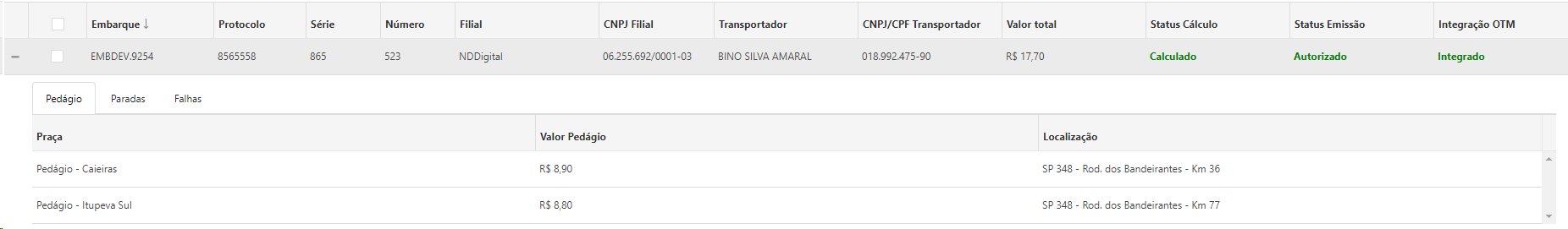 •Pedágio: Valores de cada praça de pedágio encontrada conforme paradas informadas no embarque.