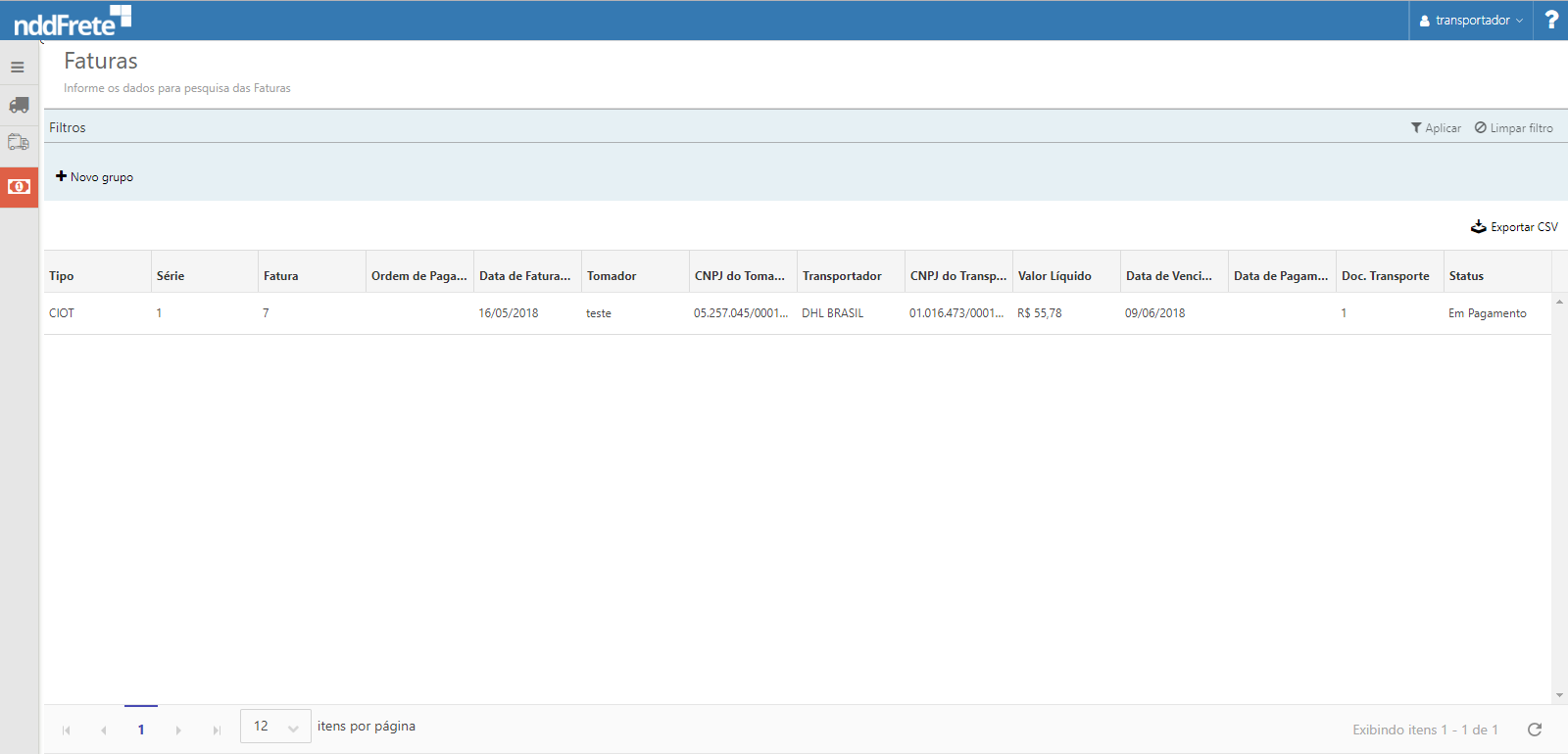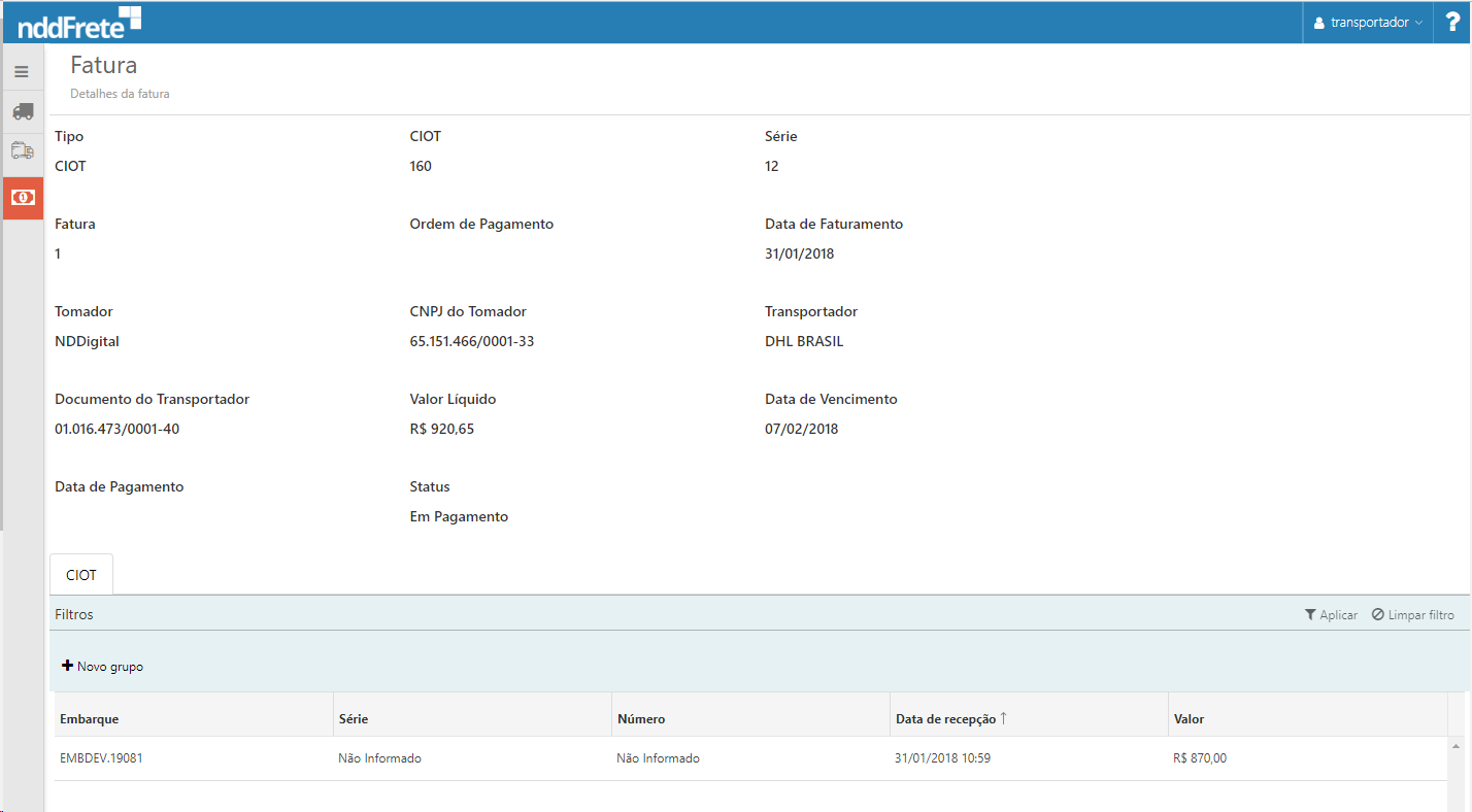 Para acessar as funcionalidades da tela de upload de documento do transportador: Menu principal>Faturas.