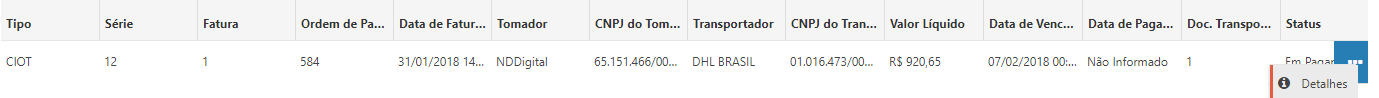 Exibindo em abas de acordo com o tipo de documentos que fazem parte da fatura, CIOT, CT-e ou NFS-e, as seguintes informações: