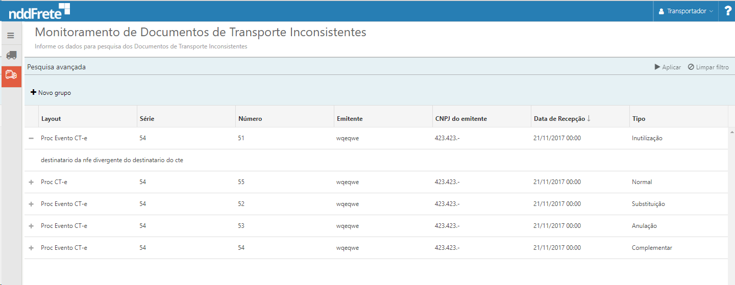 Para acessar as funcionalidades da tela de monitoramento de documentos do transportador inconsistentes: Menu principal>Documentos de Transporte>Inconsistentes.