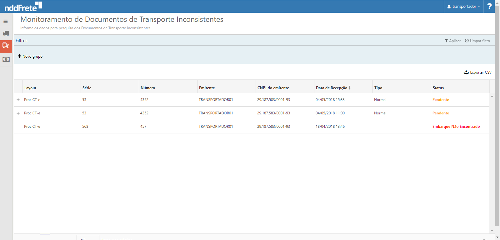 Para acessar as funcionalidades da tela de monitoramento de documentos do transportador inconsistentes: Menu principal>Documentos de Transporte>Inconsistentes.
