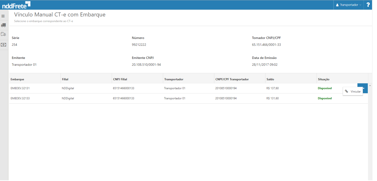 Ao clicar em Vincular Manualmente o usuário é encaminhado para uma outra tela onde ele pode visualizar os Embarques disponíveis para aquele CT-e. E então é possível fazer o vinculo do CT-e com apenas um Embarque através do menu de contexto na opção vincular.