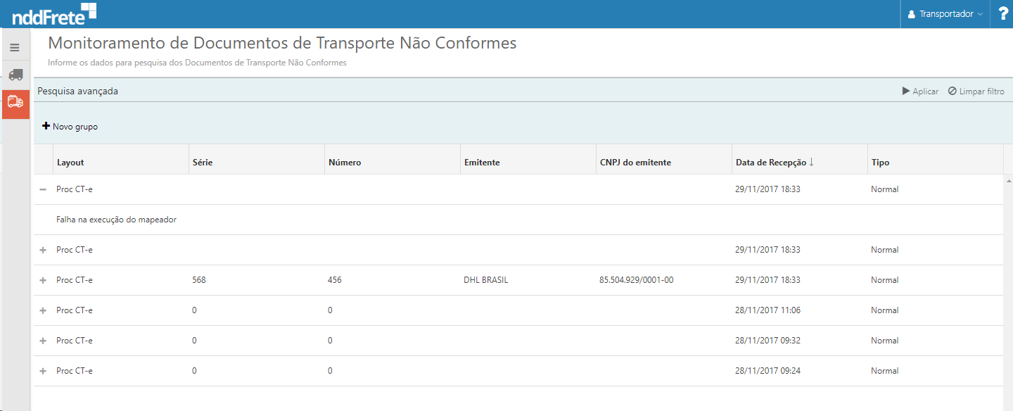 Para acessar as funcionalidades da tela de monitoramento de documentos do transportador não conformes: Menu principal>Documentos de Transporte>Não Conformes.