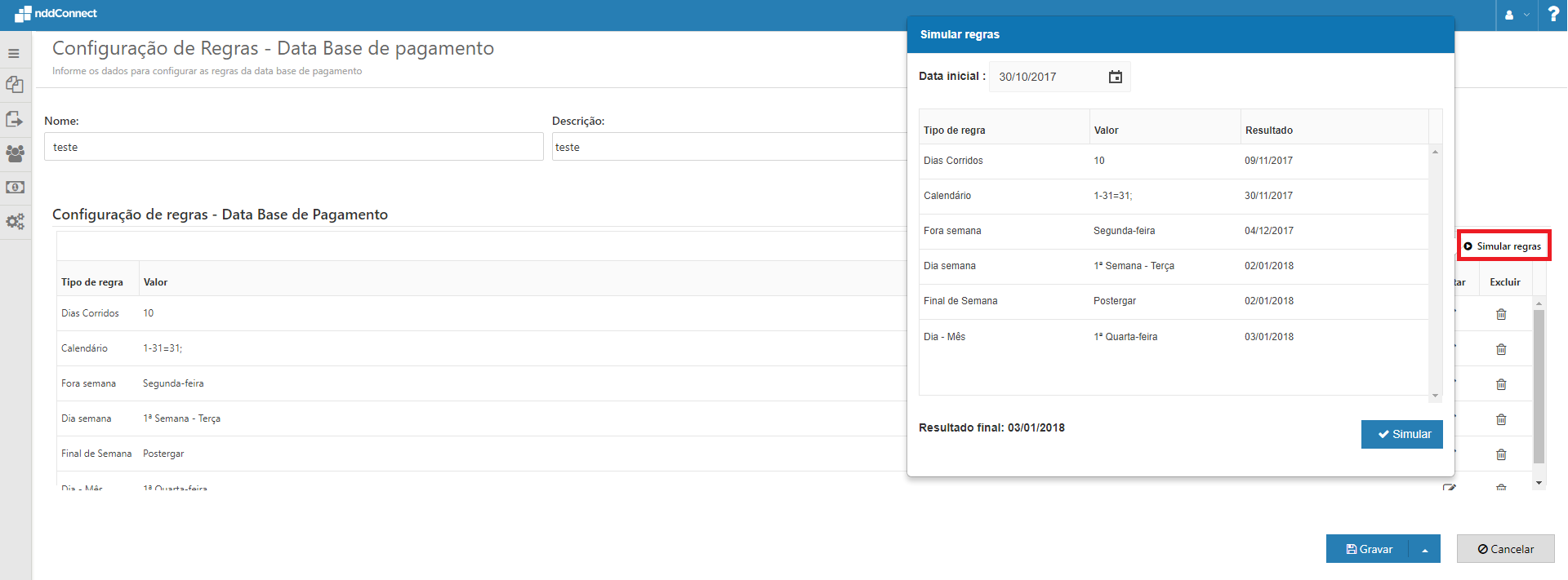 Para data base de pagamento, pode-se simular as regras configuradas, para verificar se o resultado é o almejado. Para isso basta clicar na opção "Simular Regras" e informar uma data inicial para a simulação. O resultado da execução de cada fórmula que compõe a regra é apresentado ao lado da mesma. Ao final, é apresentada a data final de cálculo da regra.