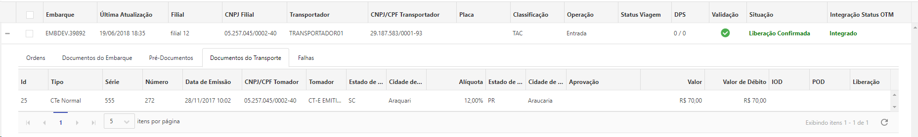A aba Documentos do Transporte exibe informações da relação de documentos de transporte (RPA, CT-e, NFS-e e Nota de débito) relacionados ao embarque.