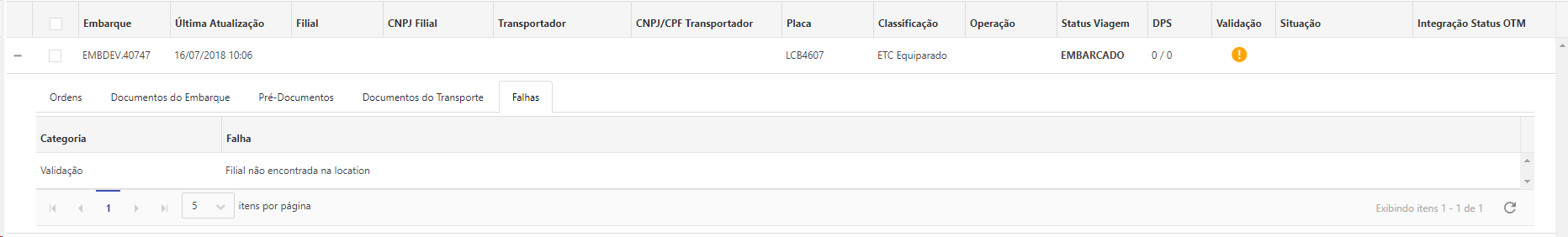 A aba Falhas exibe os erros referente ao embarque, para que seja possível efetuar as correspondentes correções. Para embarques válido exibe o motivo da falha de Integração Status OTM e motivos de falhas na tentativa de Cancelamento, se houver. Para embarques pendente e inválido, exibe o motivo pelo qual os embarques não passaram pelas regras de validação.