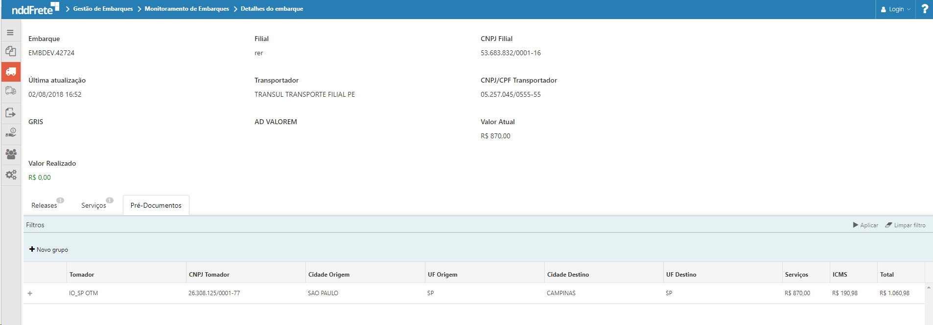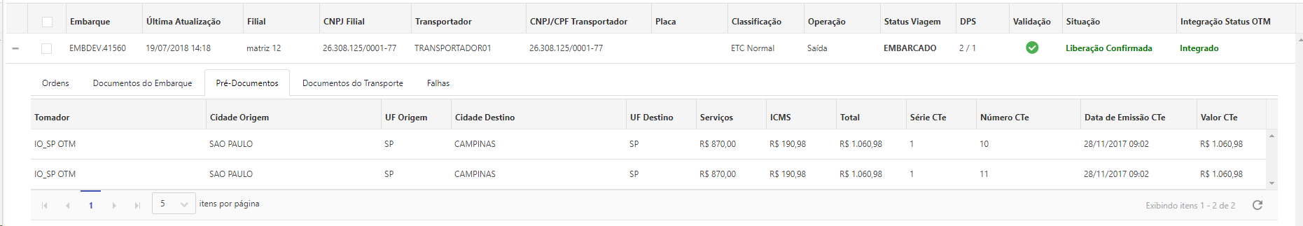 Na aba de pré documentos é apresentado todos os pré-documentos que pertencem ao Embarque acessado.