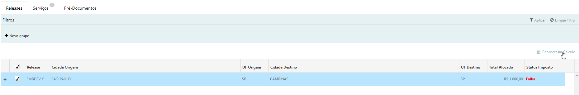 Caso o status do imposto for igual à Falha no cálculo, é possível realizar o reprocessamento do cálculo.