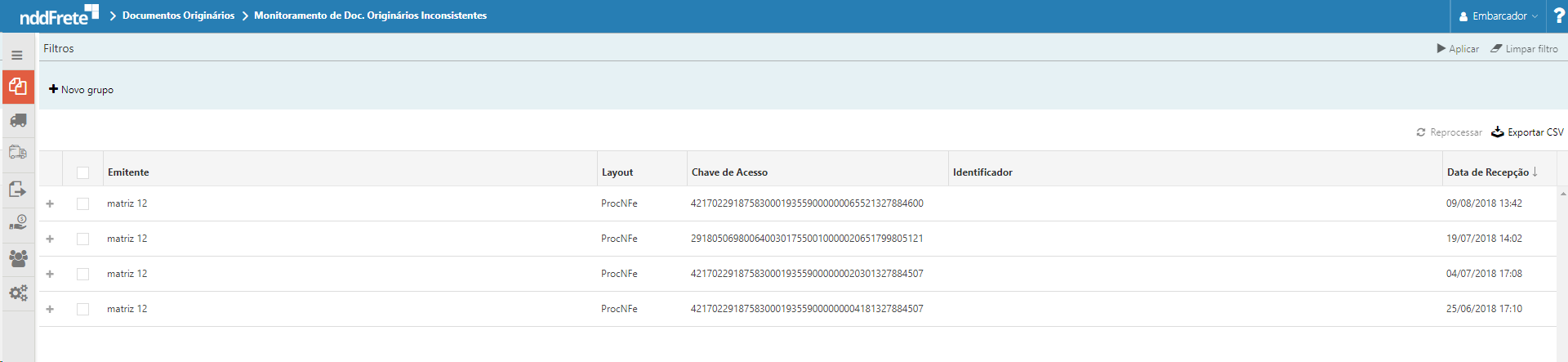 Através da tela de documentos inconsistentes, o usuário pode acompanhar o documento que não teve seu processo realizado com sucesso. Nela somente serão apresentados os documentos que possuem alguma inconsistência e podem ser reprocessados manualmente, sem ter a necessidade de o ERP realizar uma nova chamada.