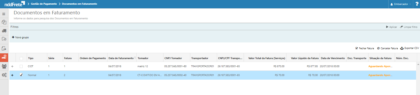 •Tipo: Tipo do documento que compõe a fatura (CT-e/NFS-e/Nota de débito ou RPA).