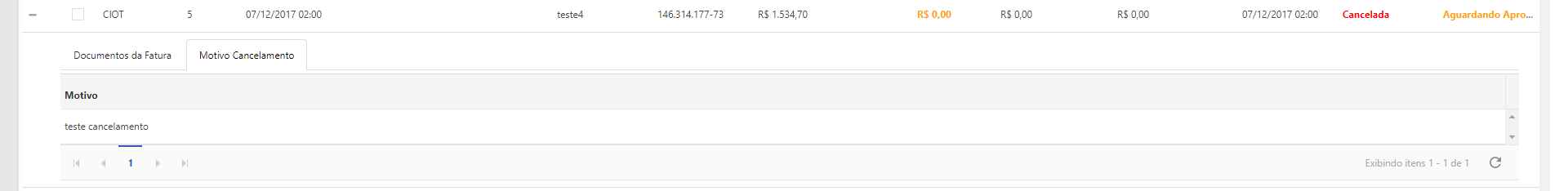 Na aba "Motivos do Cancelamento" será exibido o motivo do cancelamento da Fatura(Essa aba só é exibida se a Fatura em questão tenha sido cancelada):