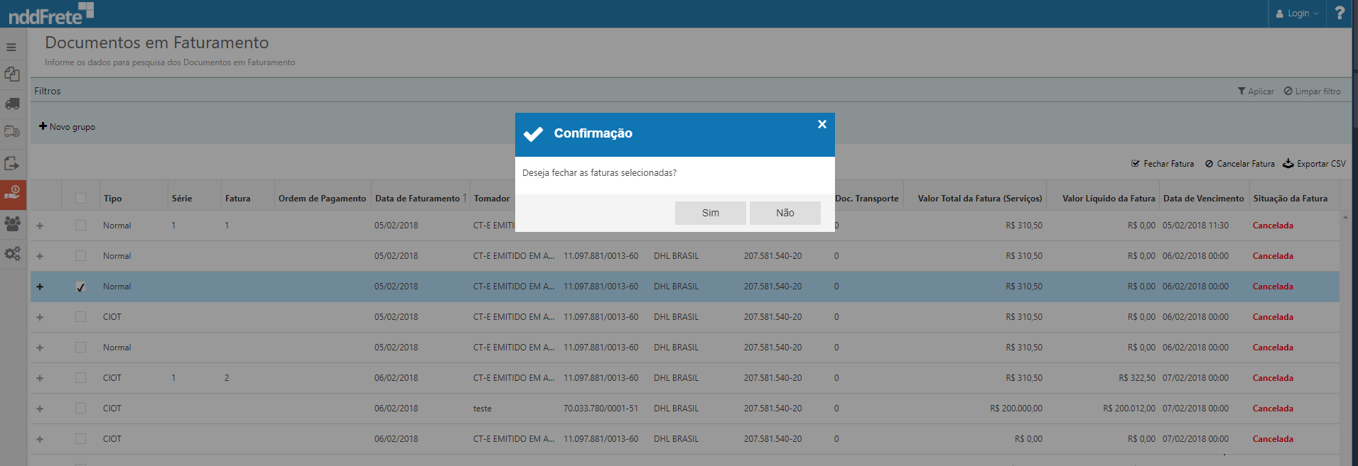 Ao clicar na ação "Fechar Fatura" é exibido um pop-up de confimação se deseja realmente fechar a fatura selecionada: