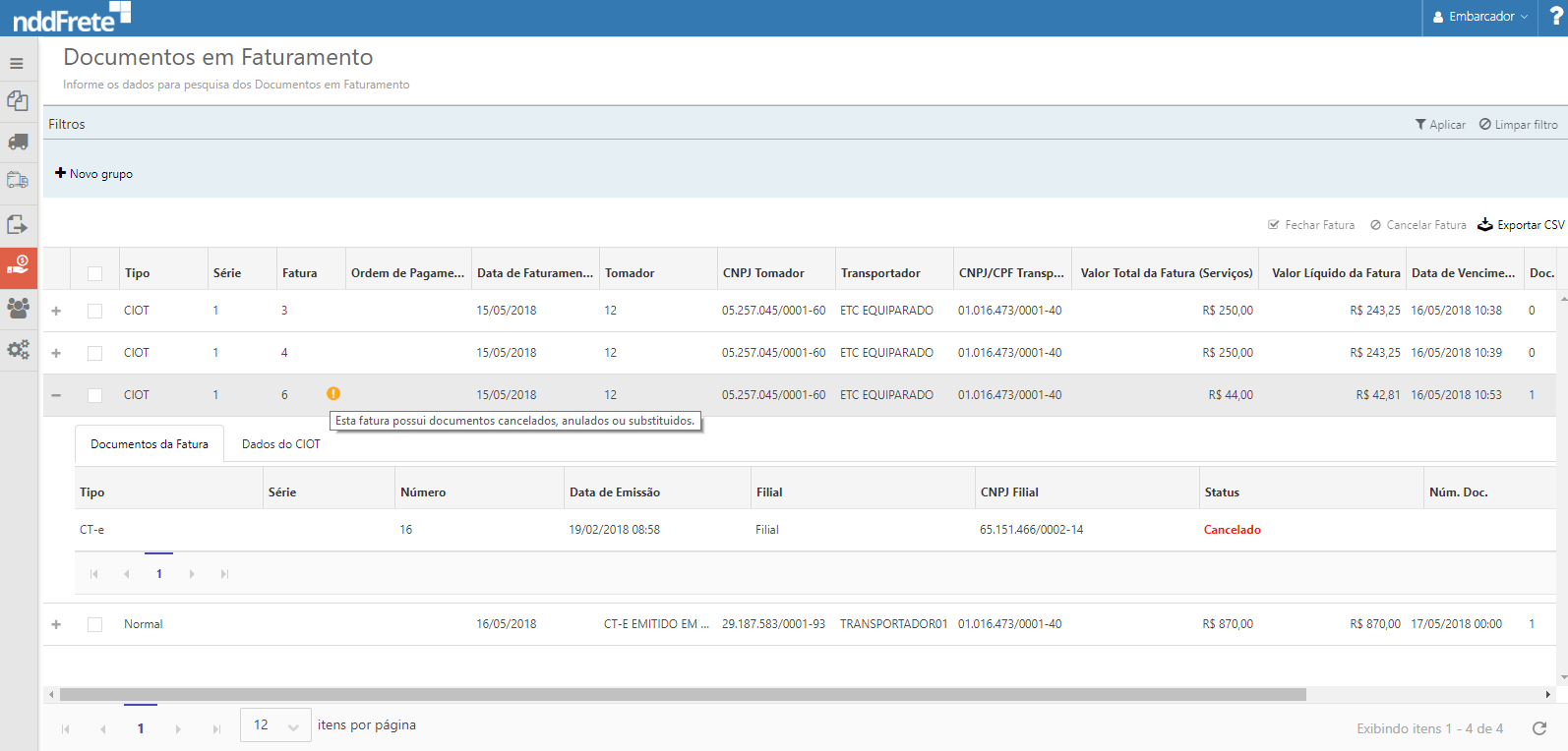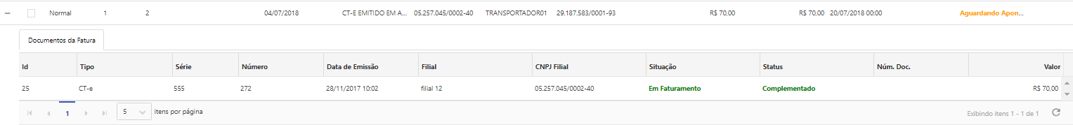 Nos detalhes da fatura, a aba "documentos da Fatura" são exibidas as seguintes informações referentes aos documentos que compõem a fatura: