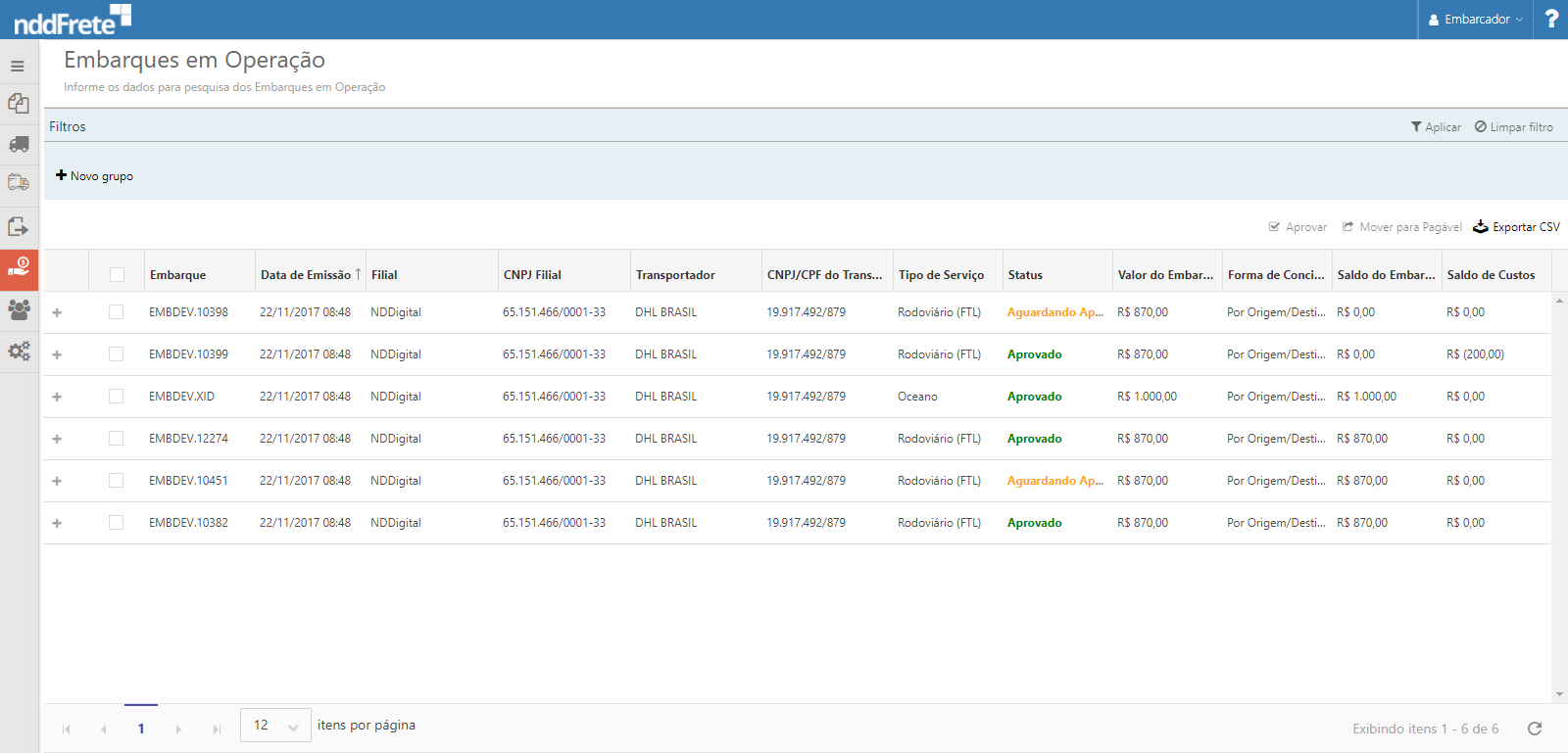 •Aprovar: Permite aprovar embarques para que possa seguir o fluxo do pagamento automático ou semi-automático;