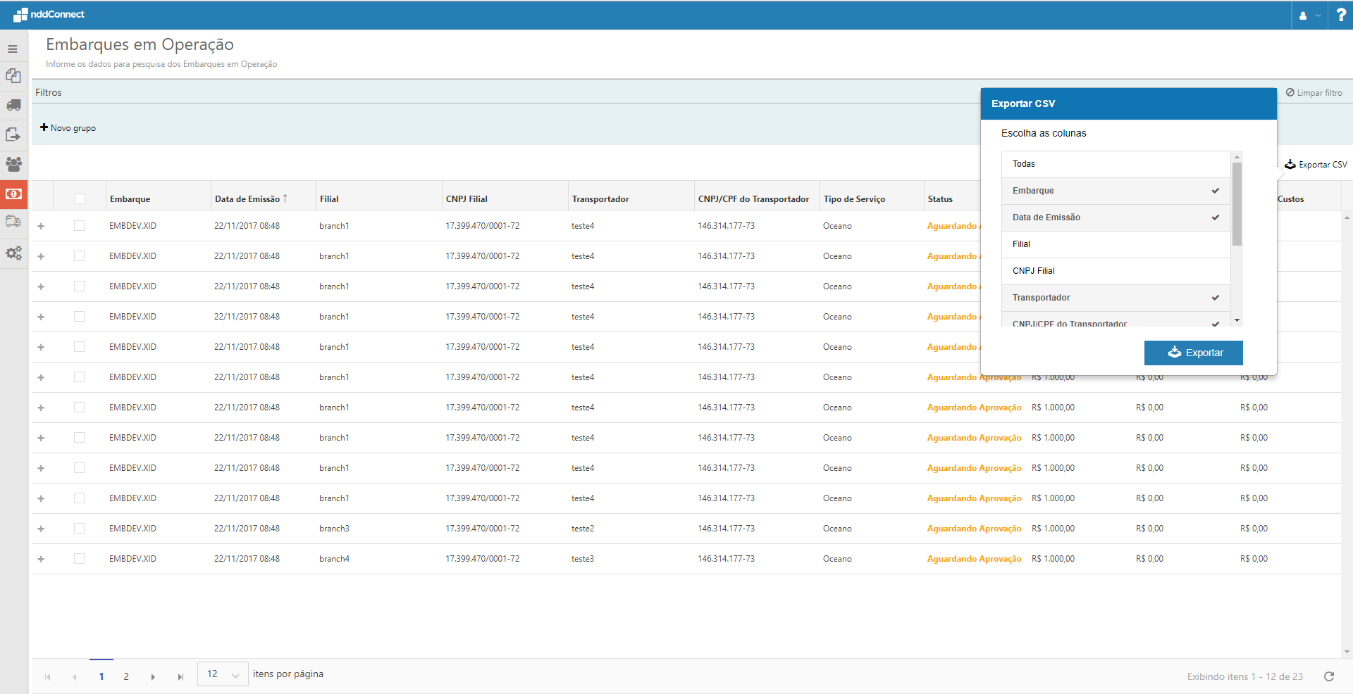 Visualização dos Embarques em Operação |