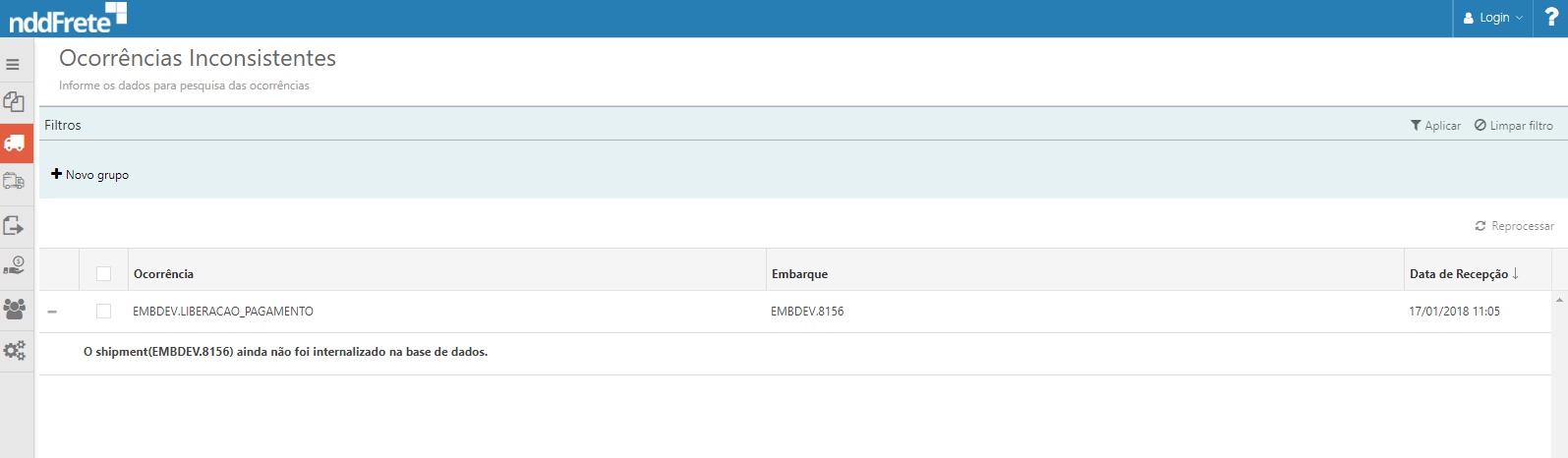 Nesta tela, são apresentadas as ocorrências que tiveram inconsistência para serem internalizadas no NDDFrete.