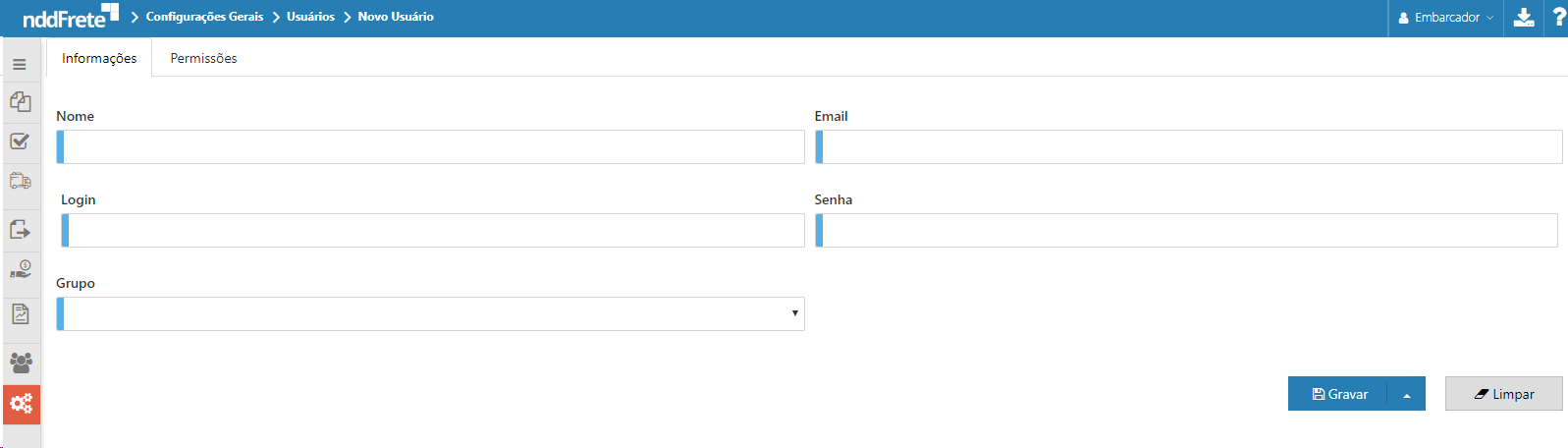 Os campos mostrados na imagem abaixo são obrigatórios para concluir o cadastro, o campo Grupo define o modelo de usuário e as respectivas funções que ele terá acesso.