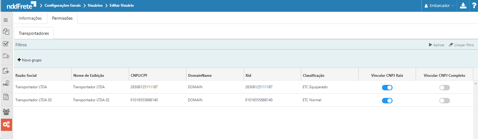É necessário habilitar quais transportadores estarão visíveis para o usuário. Esta configuração é realizada através da aba Permissões. Conforme mostra a tela abaixo, é possível vincular o CNPJ completo ou apenas o CNPJ Raiz, onde será considerado apenas os oito primeiros dígitos.