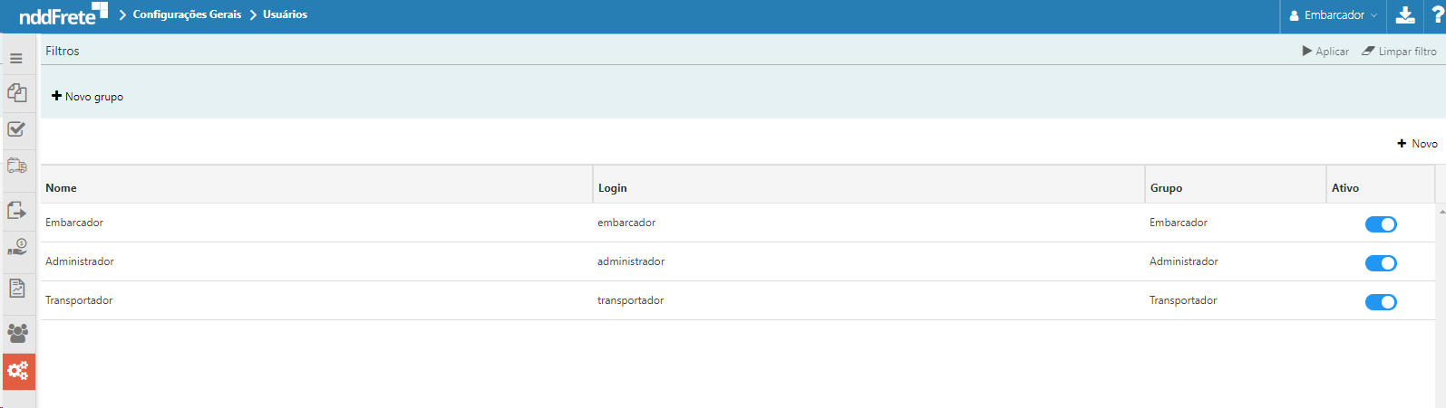 •Todo usuário já é cadastrado como Ativo, para desativar o mesmo basta deixá-lo Inativo. •Não é permitido caracteres especiais no campo Login, com exceção de: . (ponto), - (hífen) e _ (underscore). •Os transportador do Tipo TAC não são apresentados para realizar vinculo com os usuários. |