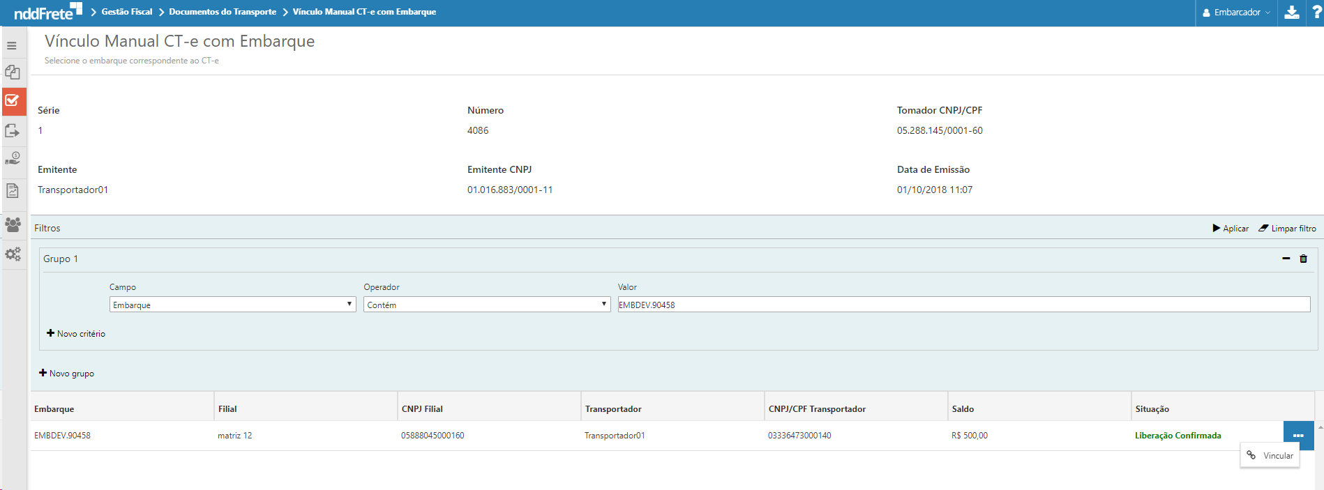 Ao ingressar nesta tela o usuário deve realizar os filtros necessários para encontrar o embarque a qual deseja vincular o documento.