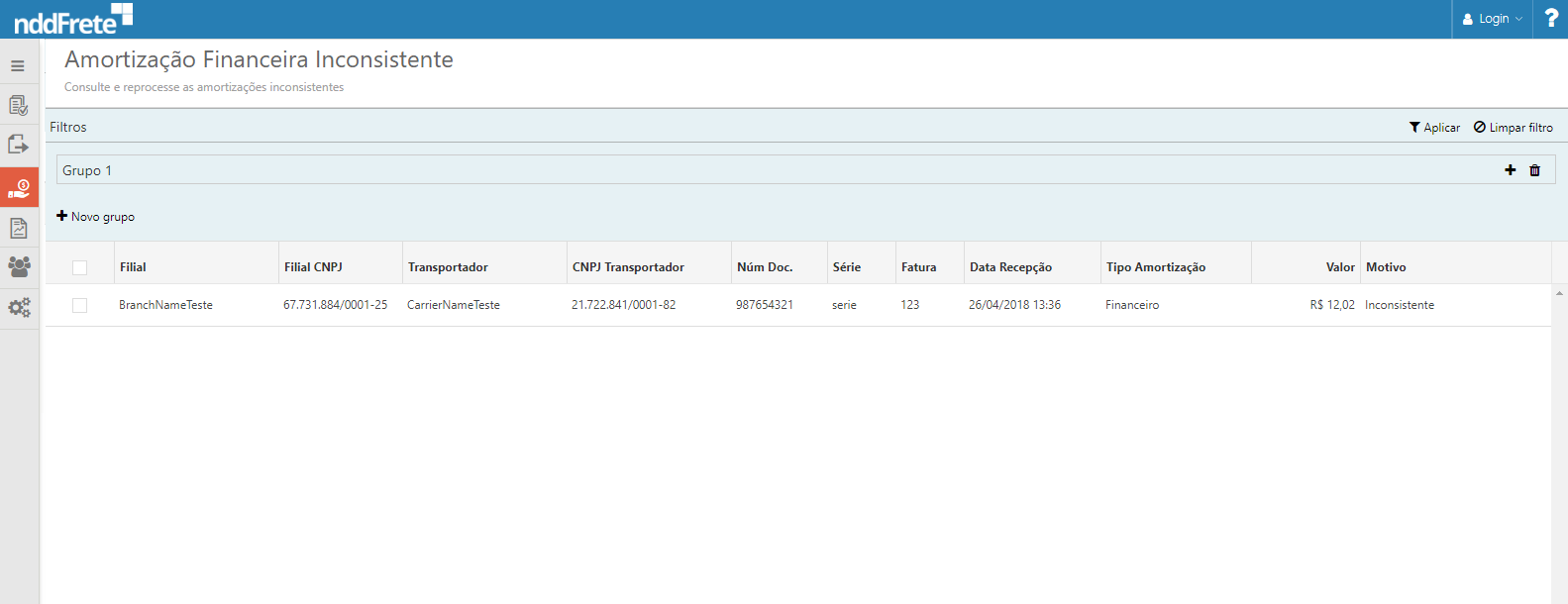 A tela de Amortização Financeira Inconsistente demonstra seus dados na tela ordenadamente de forma decrescente pela data, podendo ser filtrado  pelo usário conforme sua necessidade.