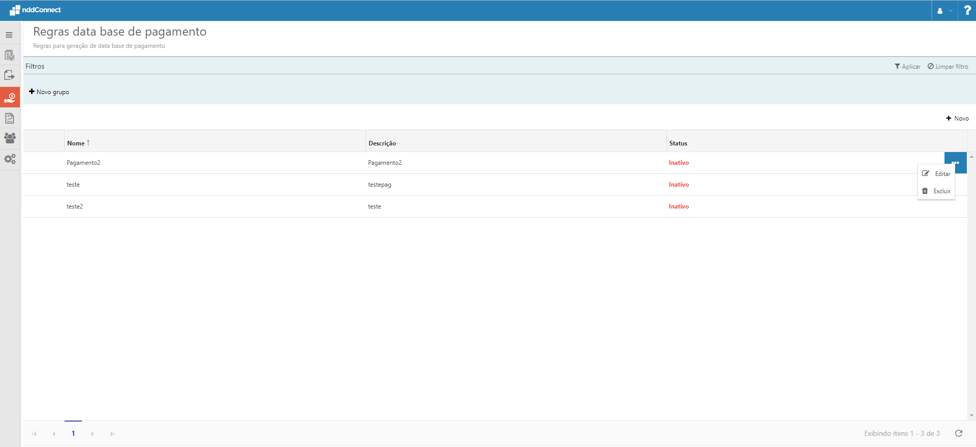Excluir: Possibilita a exclusão da regra, caso esta não esteja sendo usada, ou seja, caso seu status seja "Inativo".