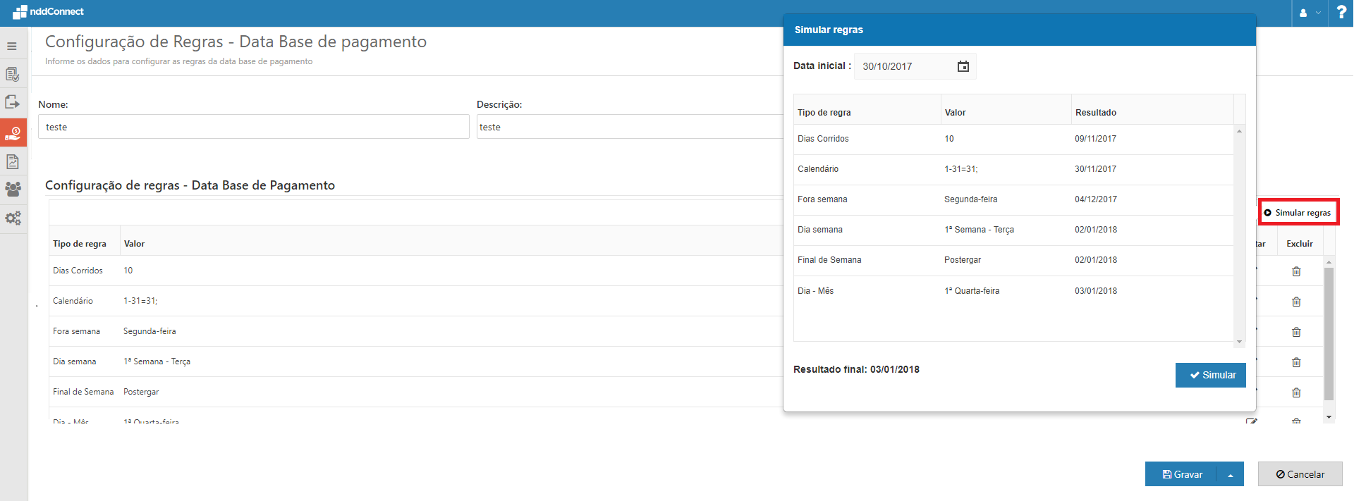 Para data base de pagamento, pode-se simular as regras configuradas, para verificar se o resultado é o almejado. Para isso basta clicar na opção "Simular Regras" e informar uma data inicial para a simulação. O resultado da execução de cada fórmula que compõe a regra é apresentado ao lado da mesma. Ao final, é apresentada a data final de cálculo da regra.