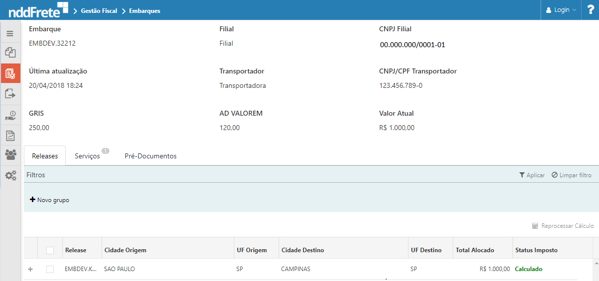 Através da aba Releases é possível visualizar todas as releases vinculadas ao embarque selecionado, bem como o total alocado em cada Release e o status do imposto, o qual possui os seguintes status possíveis no sistema nddFrete: Aguardando Cálculo, Sem cálculo, Falha no cálculo e Calculado.