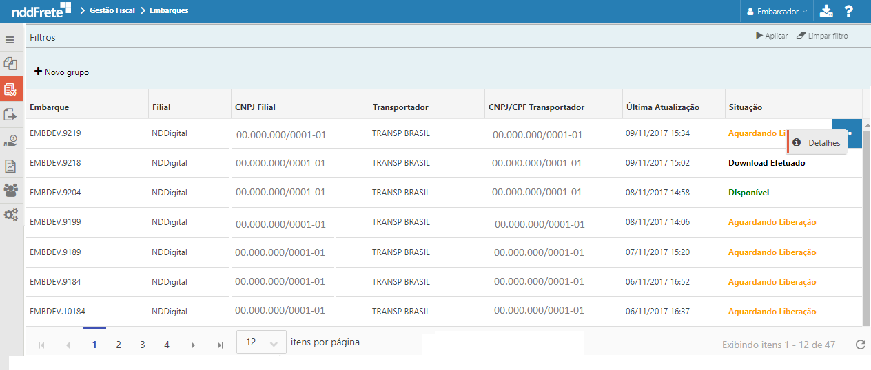 Para visualizar os Detalhes do embarque, clique no menu de contexto apresentado em cada registro e em Detalhes, conforme imagem.