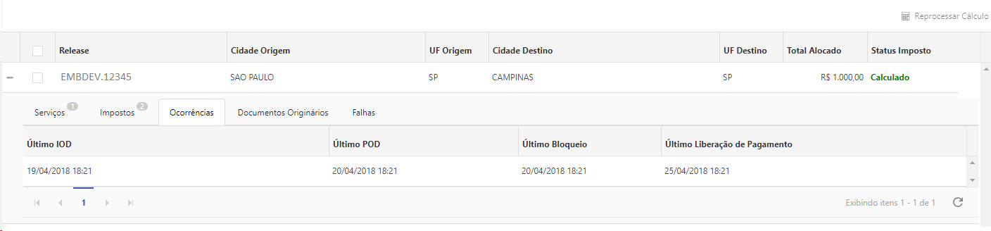 •Ocorrências: Nessa aba é possível visualizar todas as ocorrências geradas para Release vinculada ao Embarque selecionado.