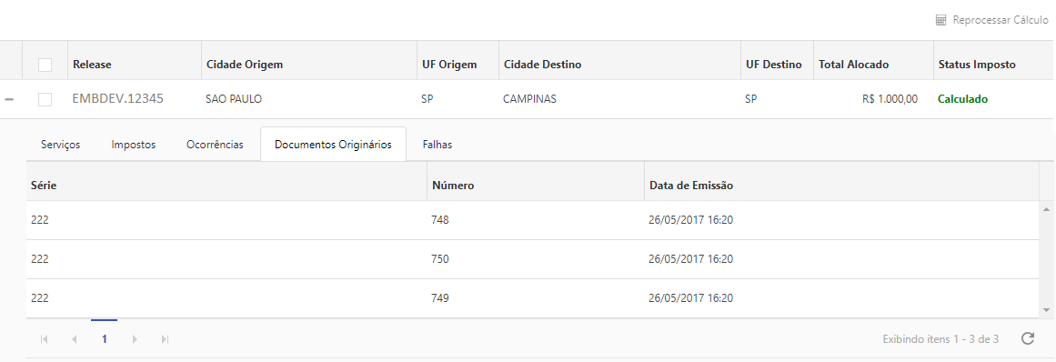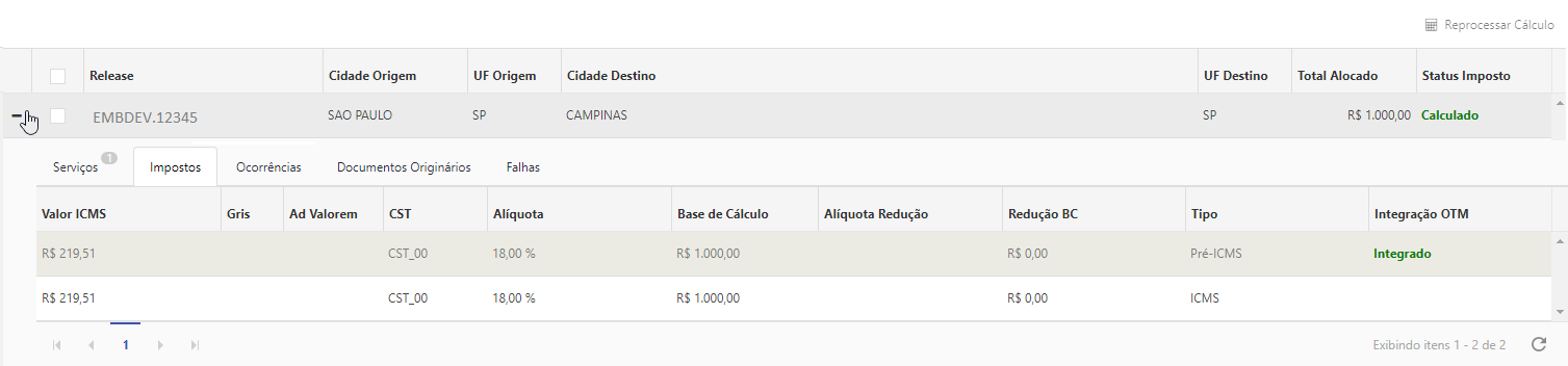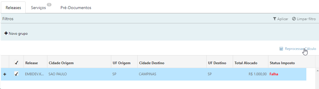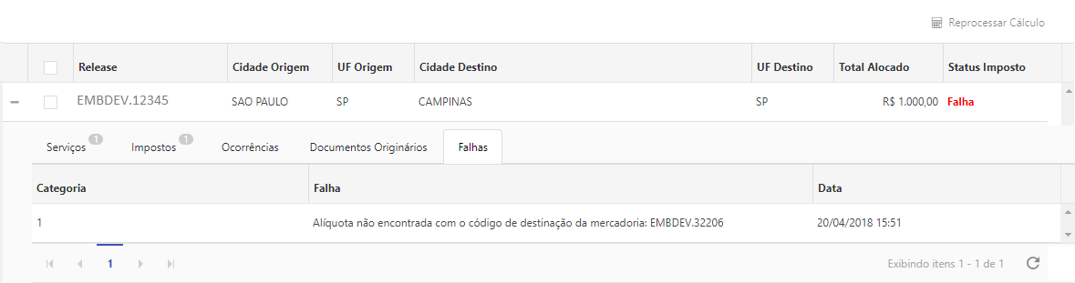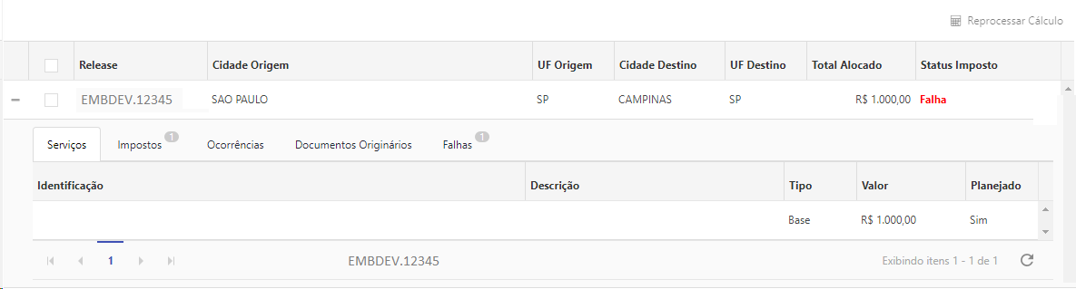 Caso o status do imposto for igual à Falha no cálculo, é possível realizar o reprocessamento do cálculo.