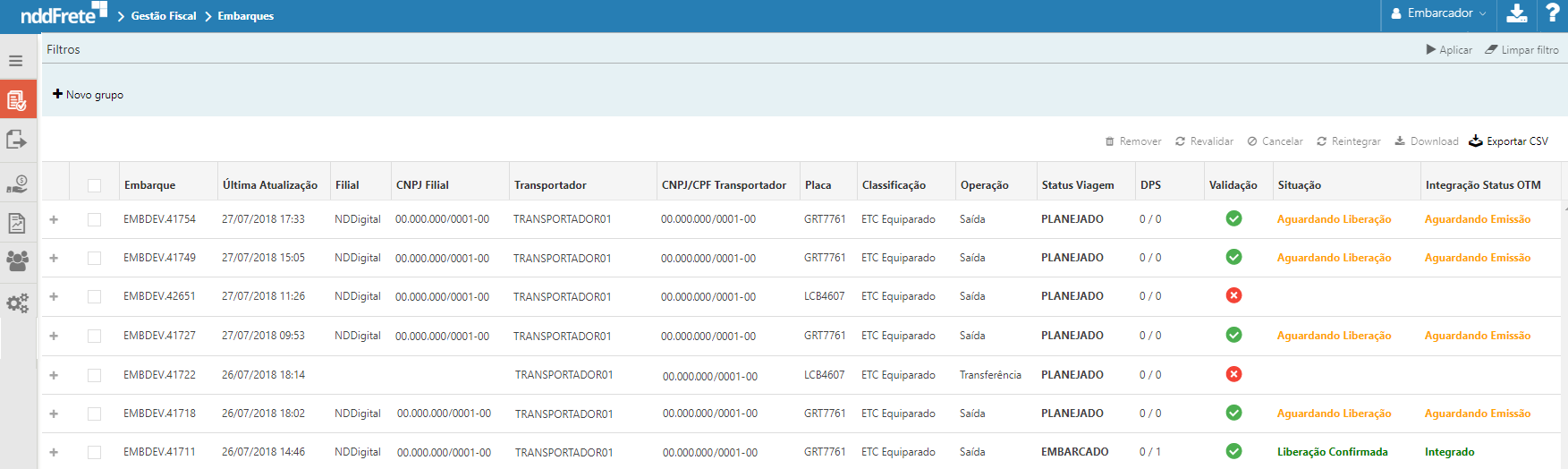 •Revalidar: Ação disponível apenas para embarques pendentes, onde é possível solicitar o reprocessamento do mesmo, após realizar as correções, para que este passe novamente pelas validações.