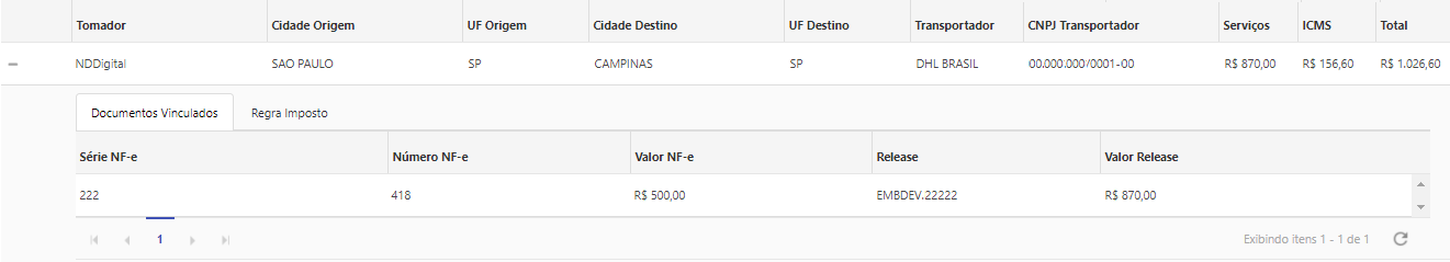 Ao acessar os detalhes do Pré-Documento através do botão + apresentado em cada registro. É possível visualizar os detalhes do documento, os quais são divididos em duas abas Documentos Vinculados e Regra de imposto.
