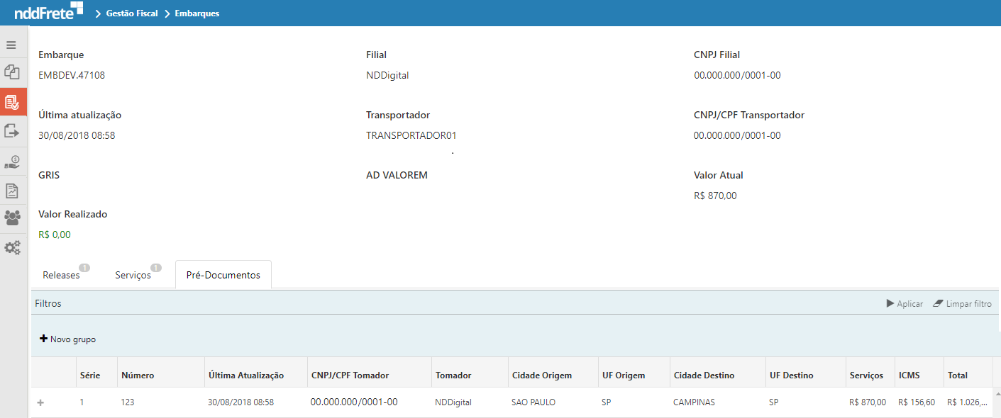 Na aba de pré-documentos é apresentado todos os pré-documentos que pertencem ao Embarque acessado.